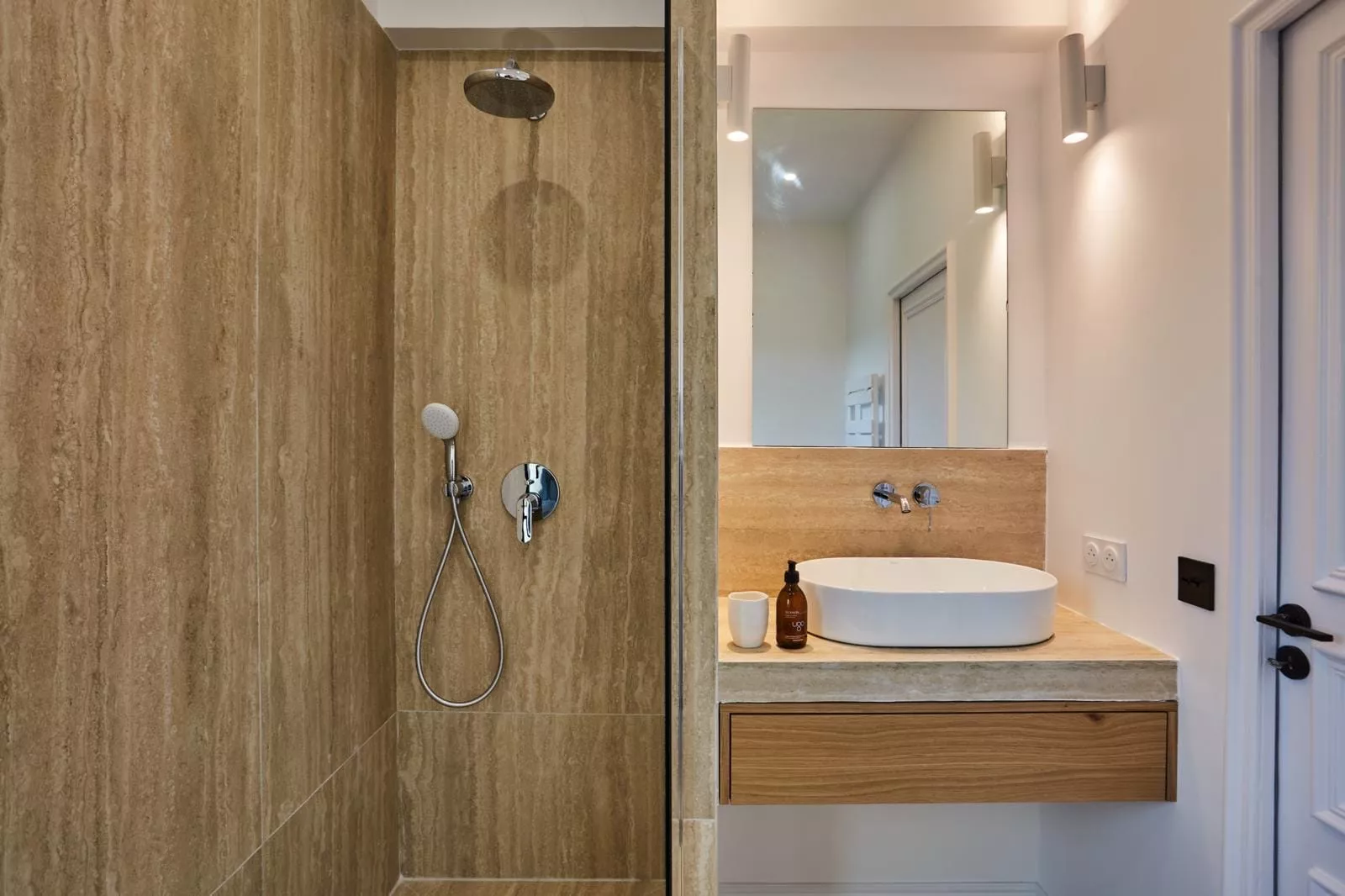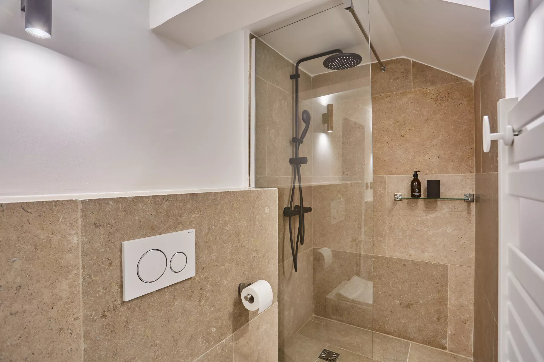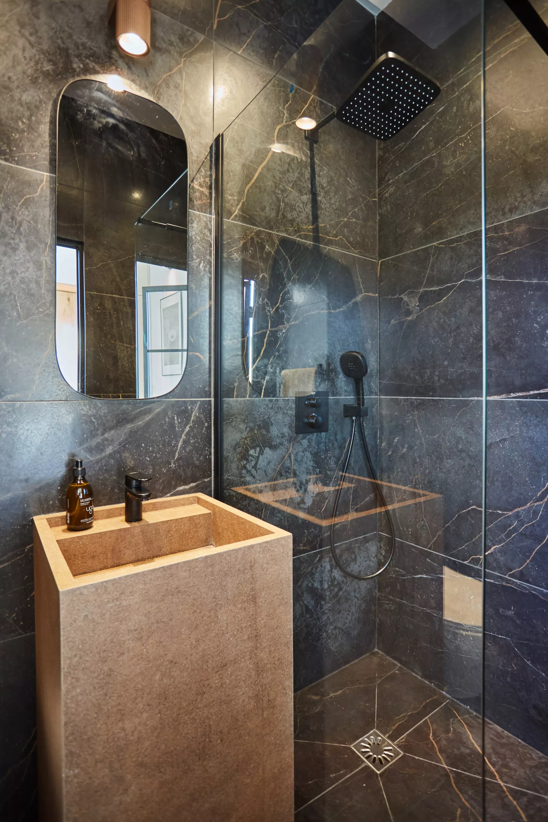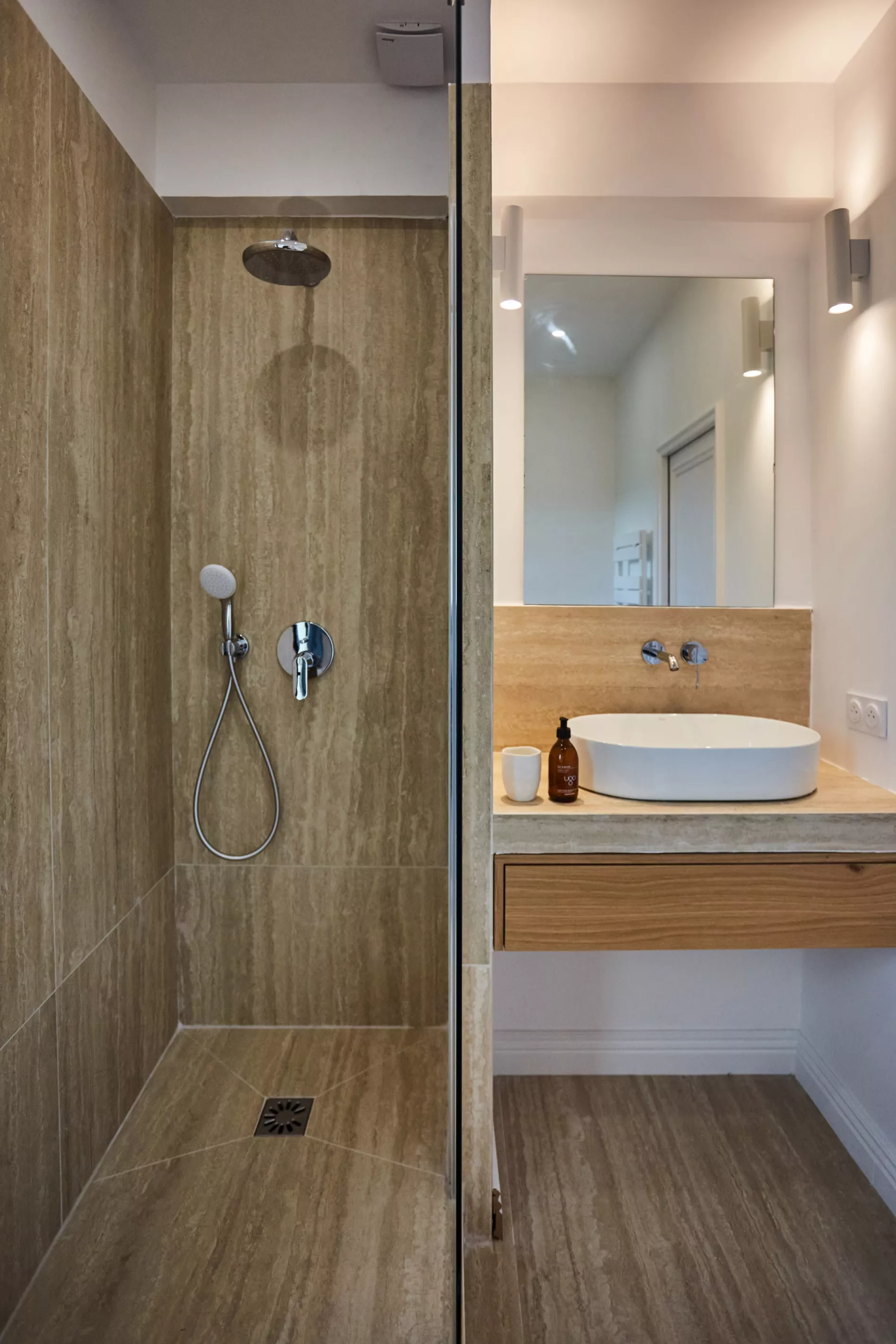 Pour ce projet, chaque salle de bain a été conçue sur mesure avec des meubles vasque carrelés et une robinetterie encastrée Grohe, offrant un rendu épuré et haut de gamme.