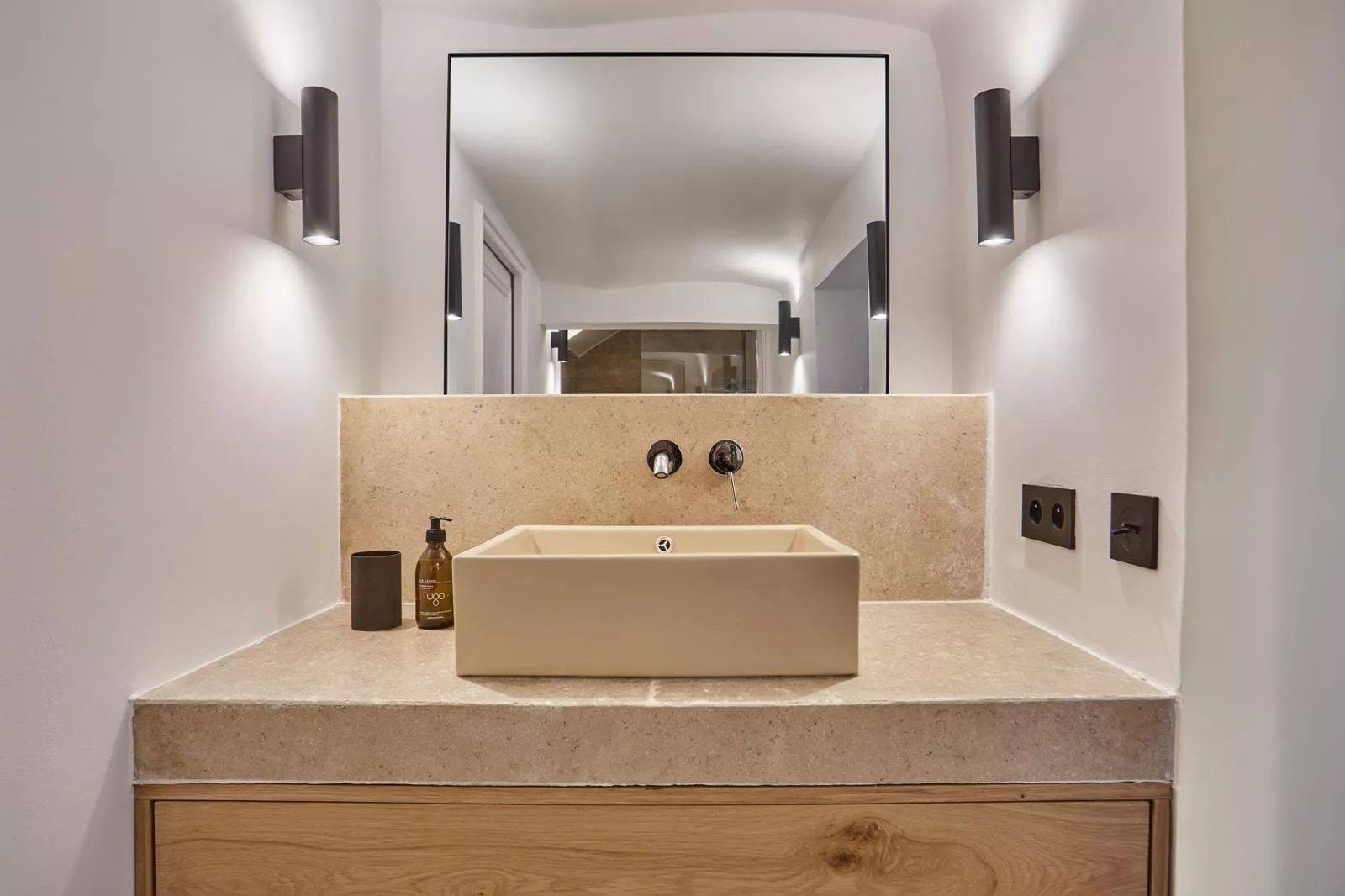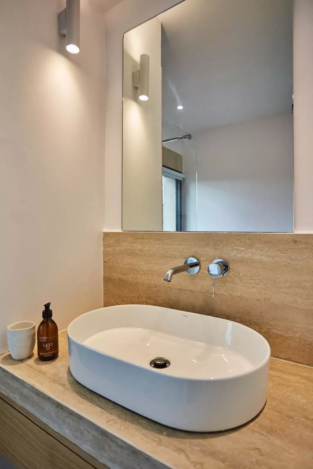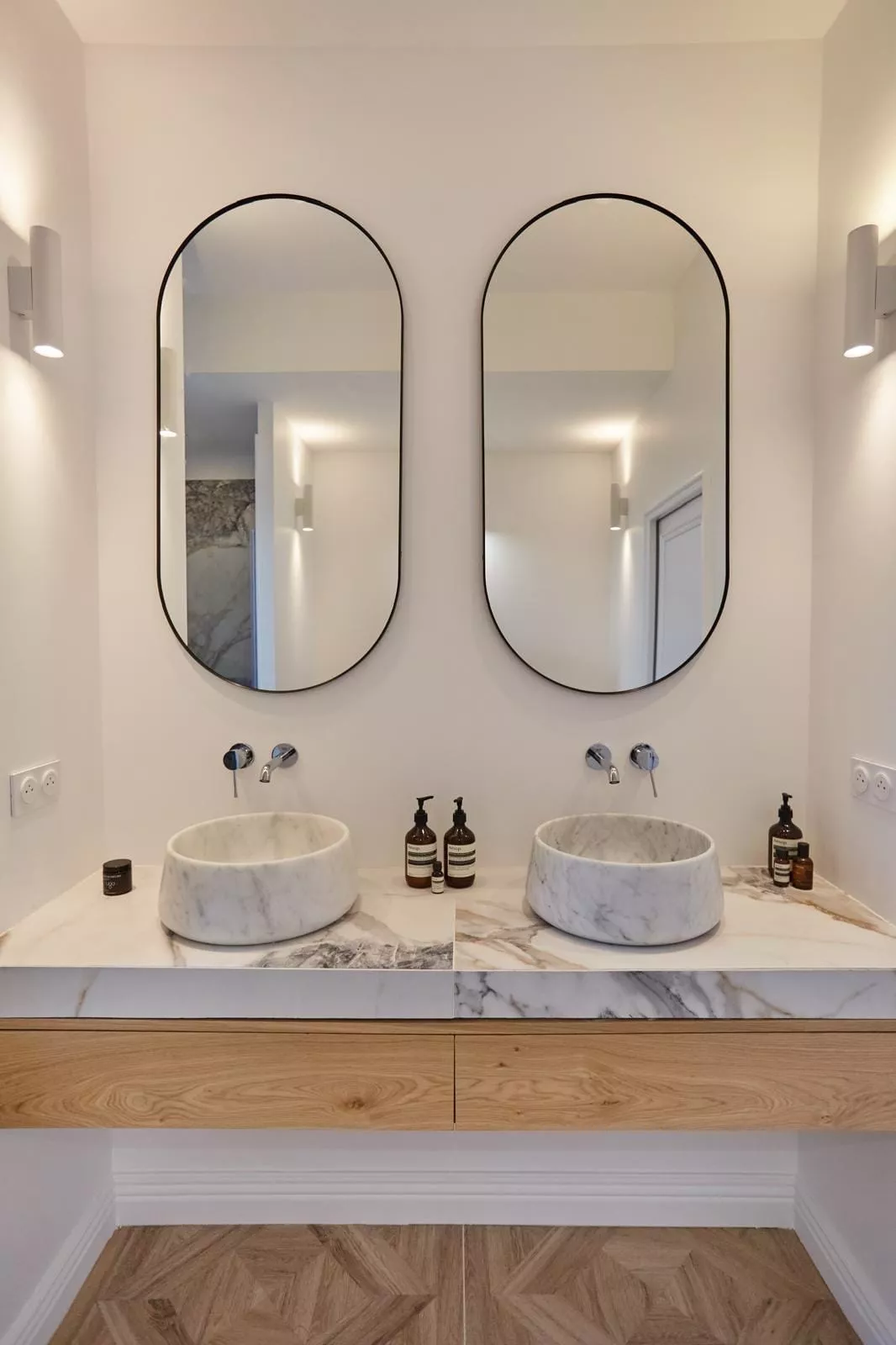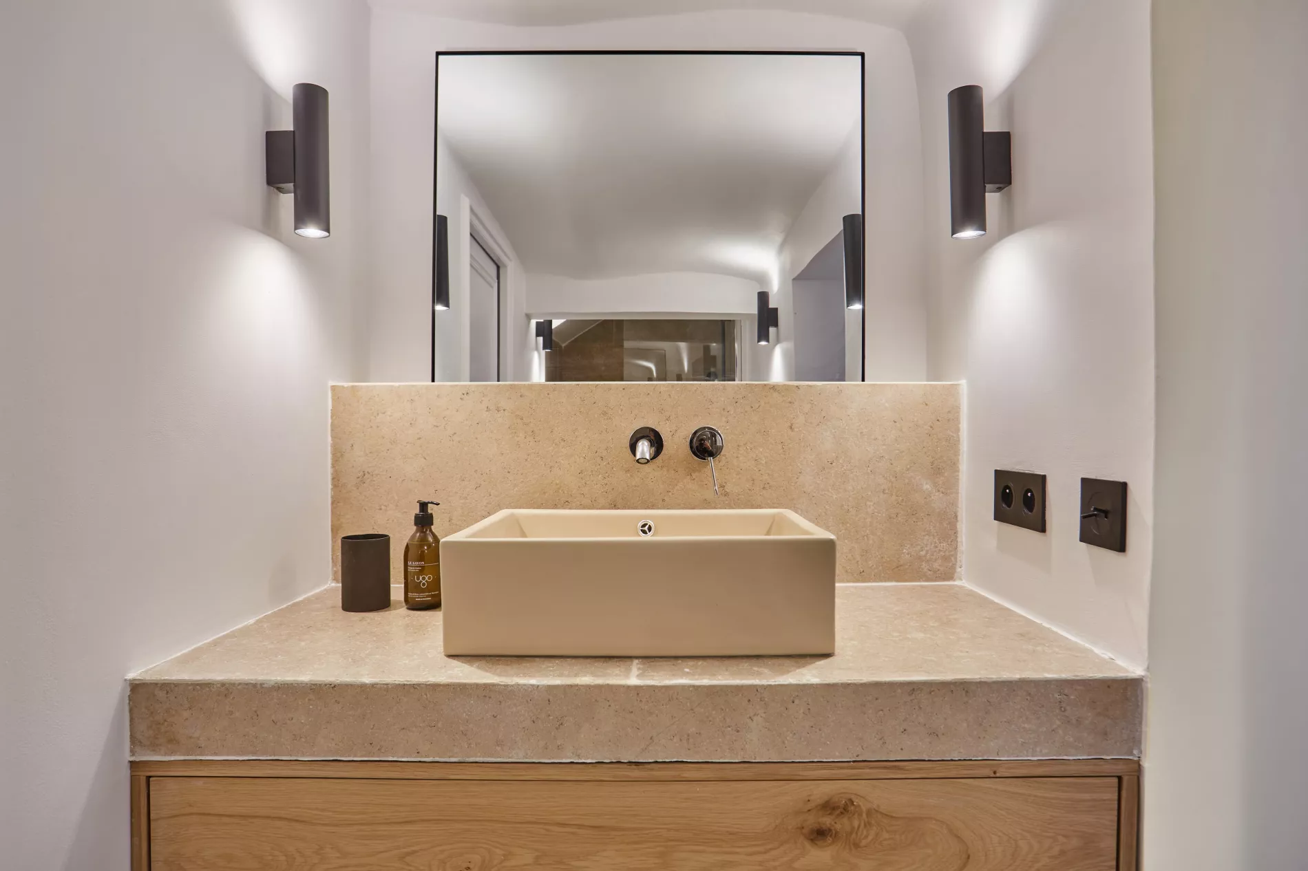 Pour ce projet, chaque salle de bain a été conçue sur mesure avec des meubles vasque carrelés et une robinetterie encastrée Grohe, offrant un rendu épuré et haut de gamme.