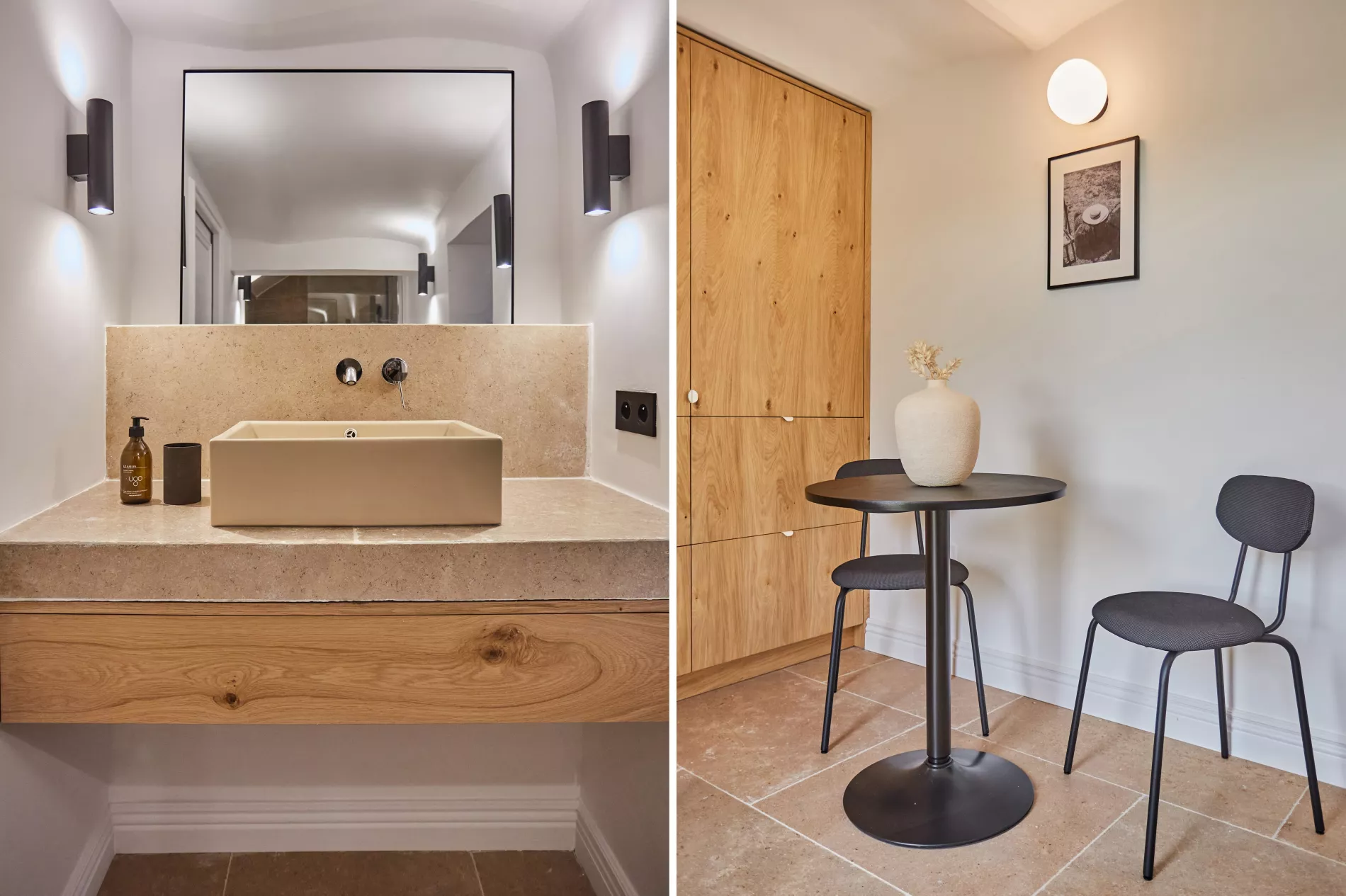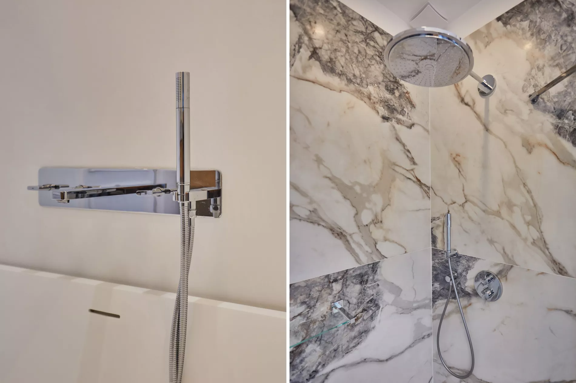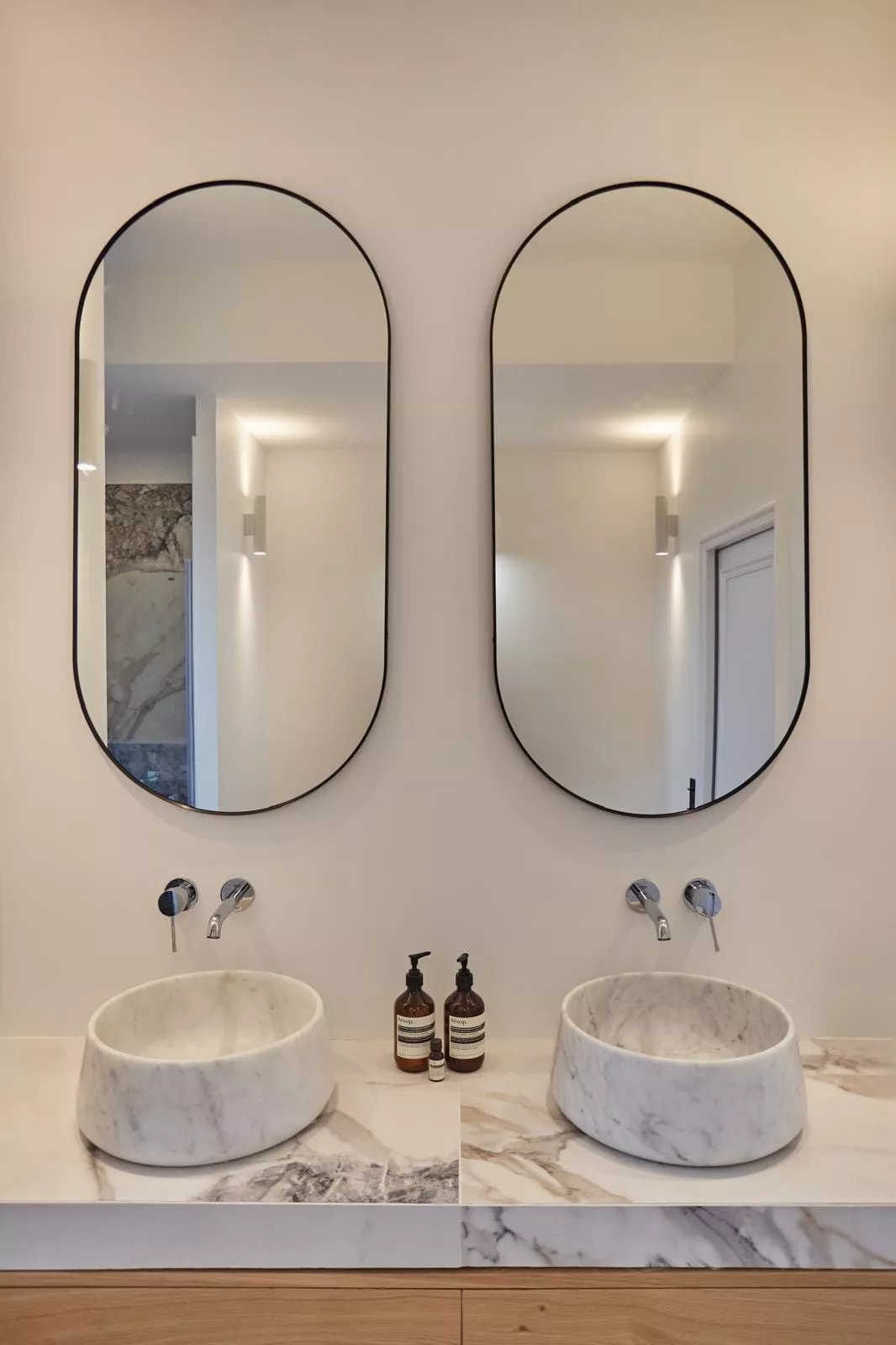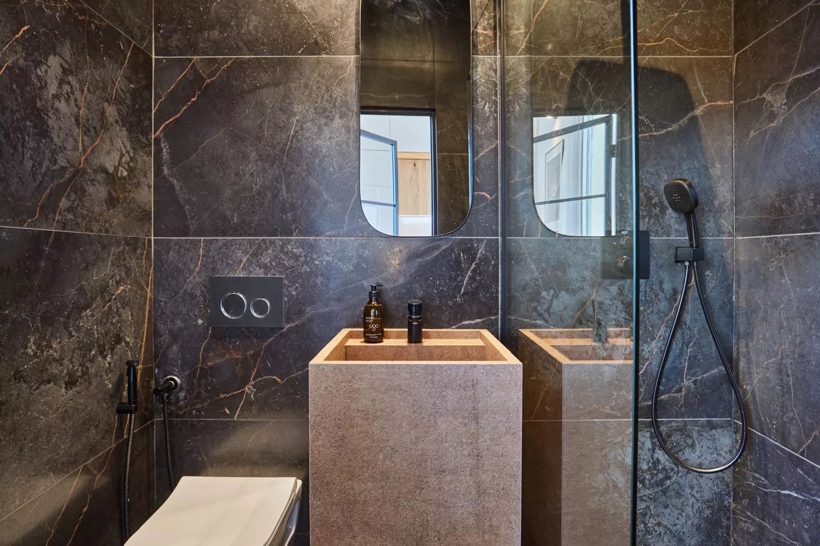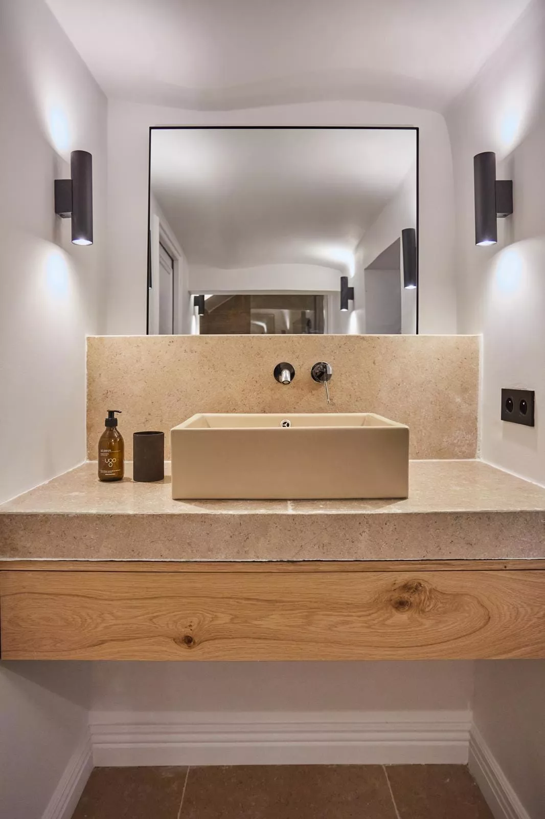 Pour ce projet, chaque salle de bain a été conçue sur mesure avec des meubles vasque carrelés et une robinetterie encastrée Grohe, offrant un rendu épuré et haut de gamme.