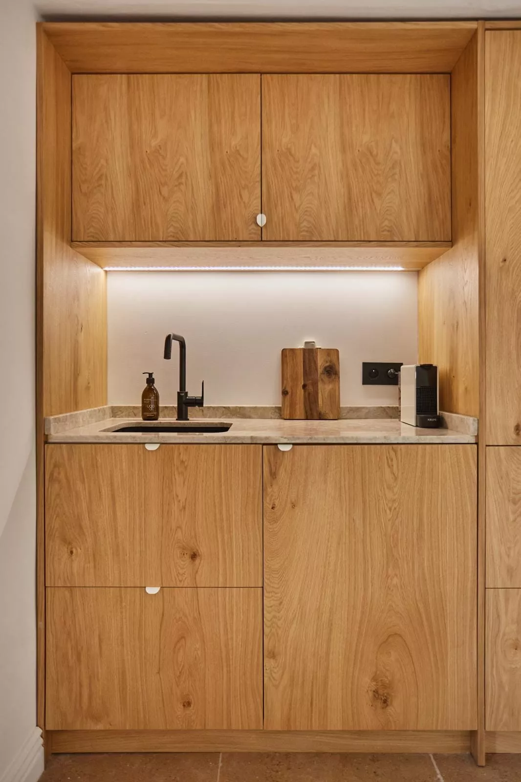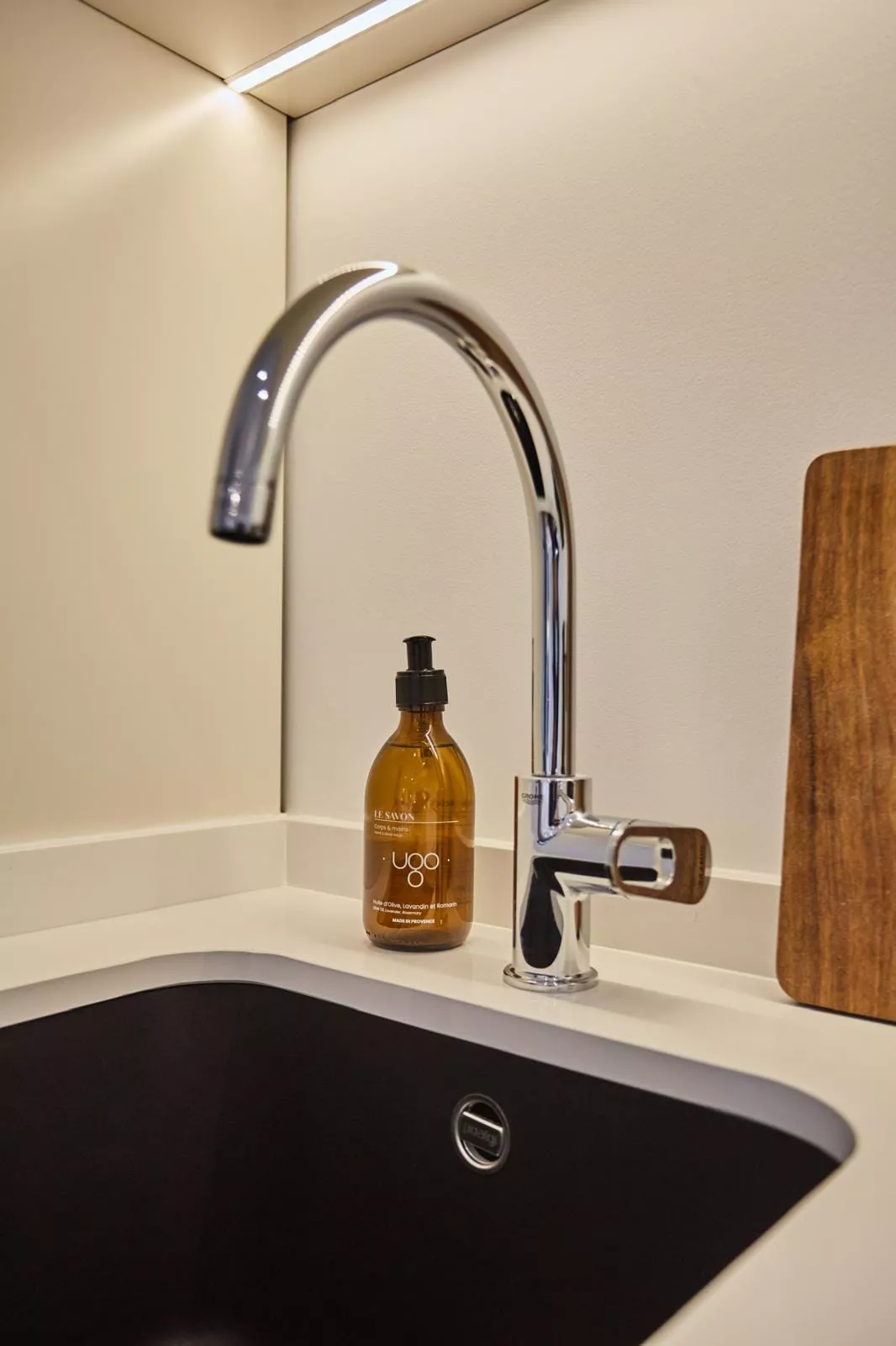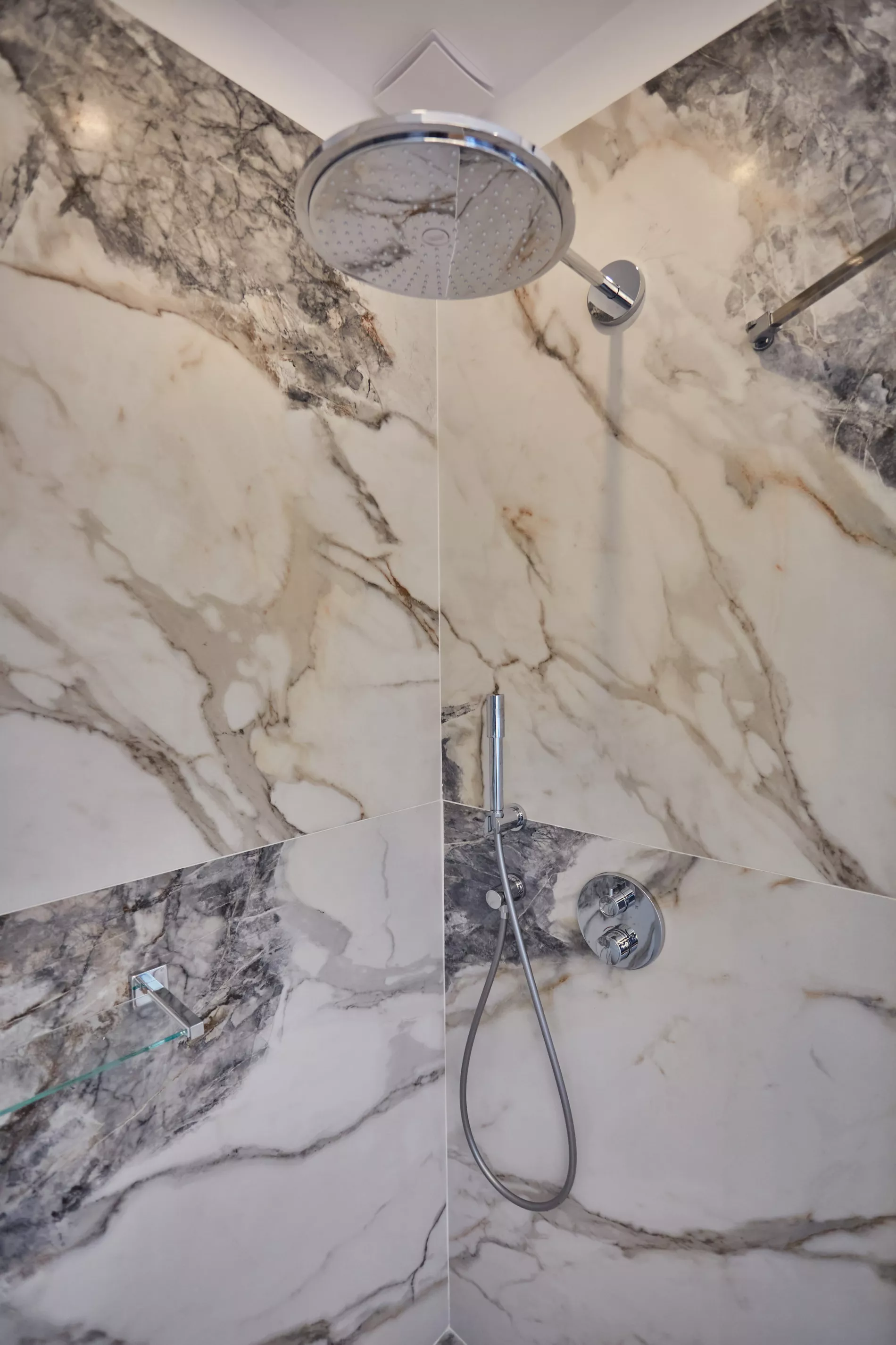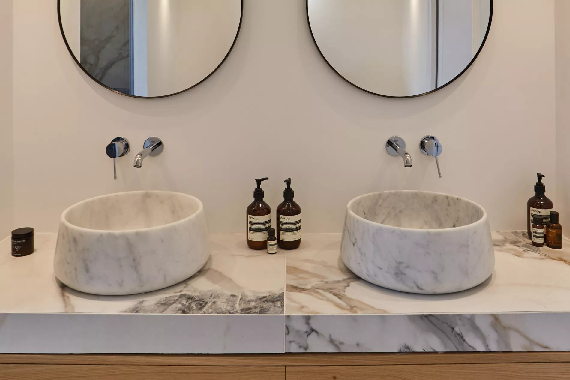 Pour ce projet, chaque salle de bain a été conçue sur mesure avec des meubles vasque carrelés et une robinetterie encastrée Grohe, offrant un rendu épuré et haut de gamme.