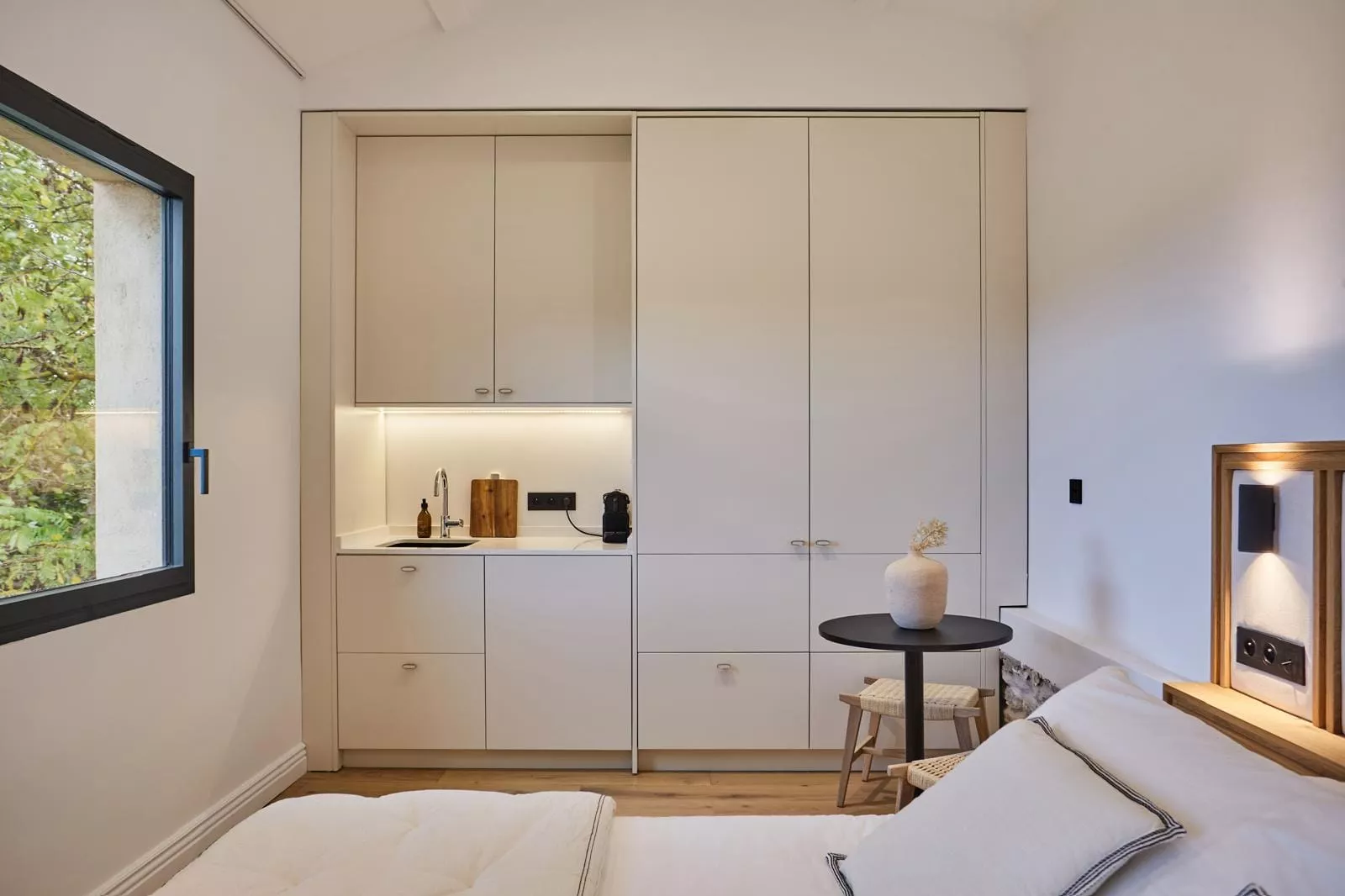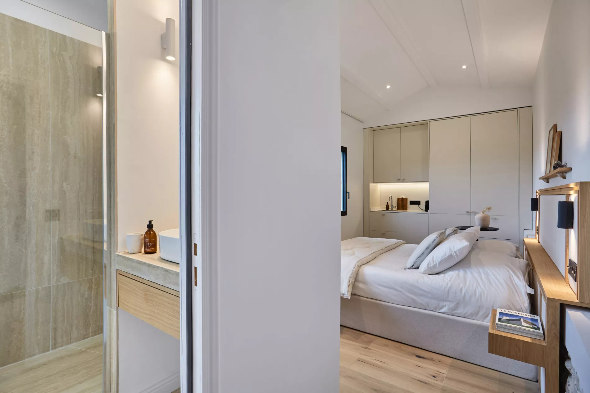 Chaque studio de 25 m² dispose de sa propre salle de bain complète et d'une climatisation indépendante, offrant un confort autonome tout en s'intégrant harmonieusement à l'ensemble de la propriété.
