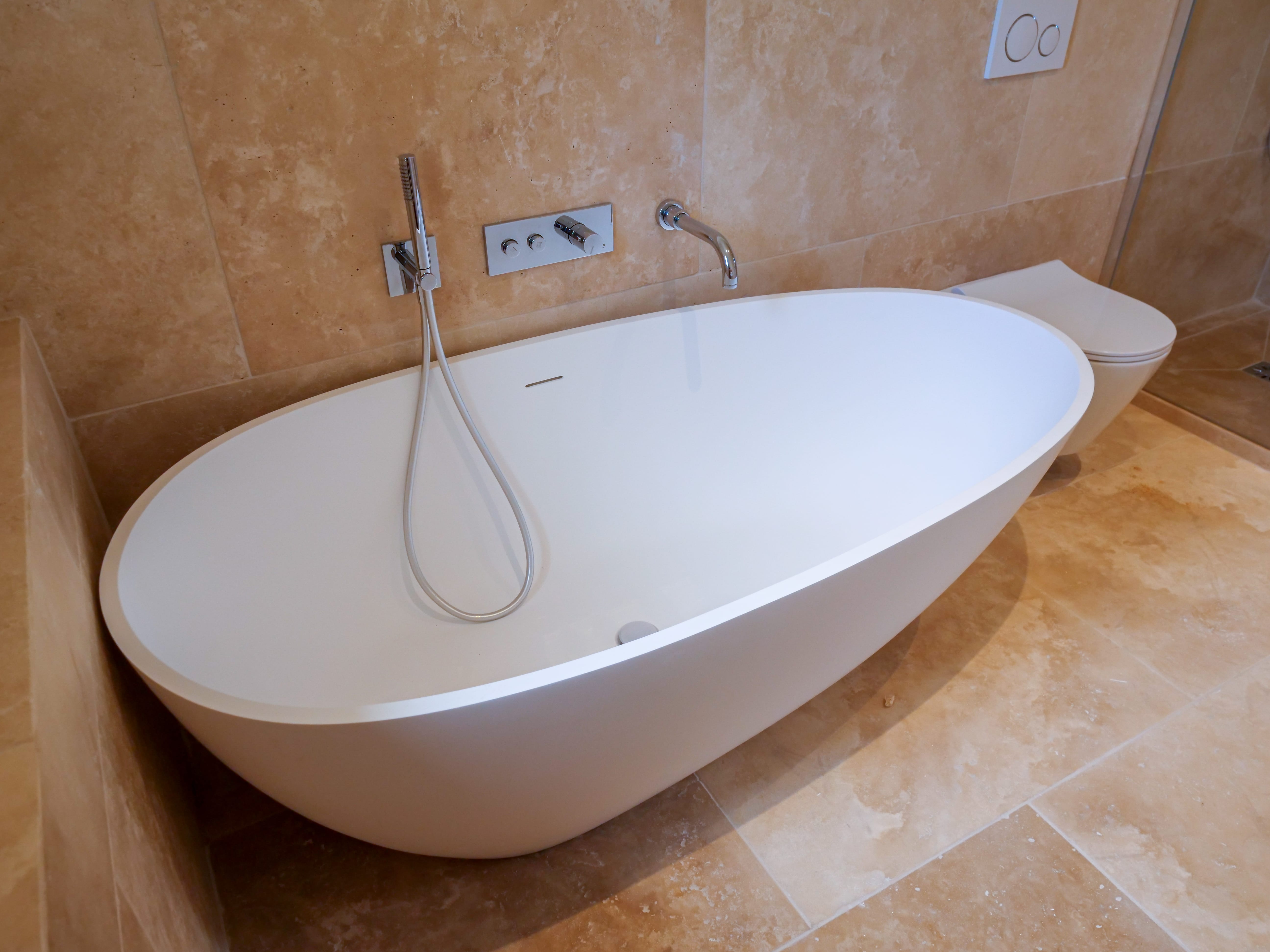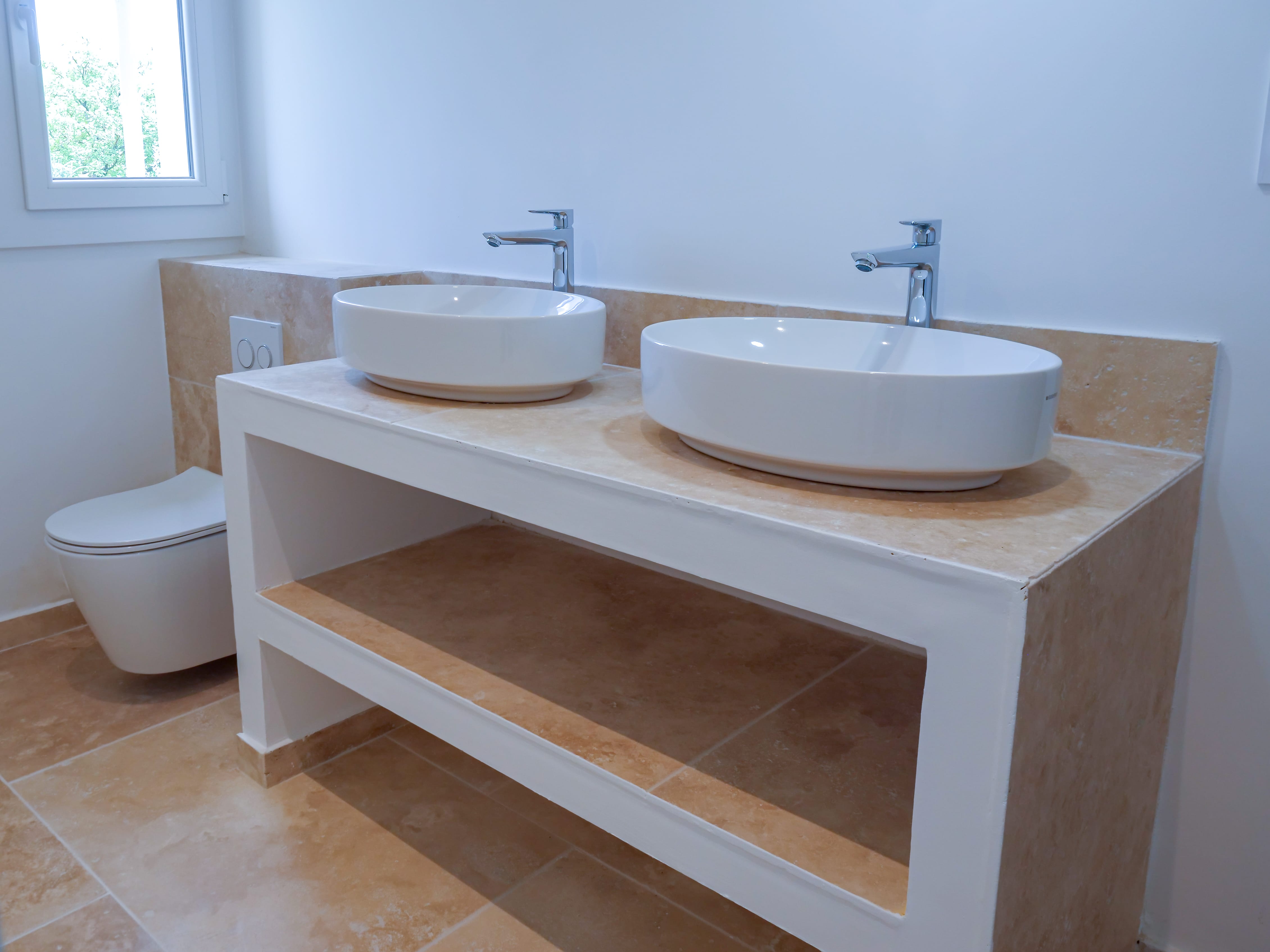 Nous avons installé des équipements haut de gamme : douches à l'italienne avec receveurs Wedi, baignoires îlot, robinetterie encastrée Hansgrohe et WC suspendus Geberit pour un design épuré et un entretien facilité.